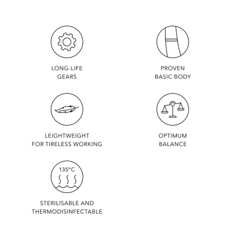 Designed for versatility, the interchangeable heads of MK-dent contra-angle handpieces save time and enhance sustainability. A simple turn of the tension ring allows you to choose from various drill heads for different indications. Crafted from stainless steel and coated with titanium or chrome, these heads offer unmatched longevity. The standard gear design ensures a constant speed ratio in the contra-angle handpieces, with options ranging from 1:5 to 14.8:1 for different indications, speeds, and torque ranges. This user-friendly technology is tailored for everyday use.